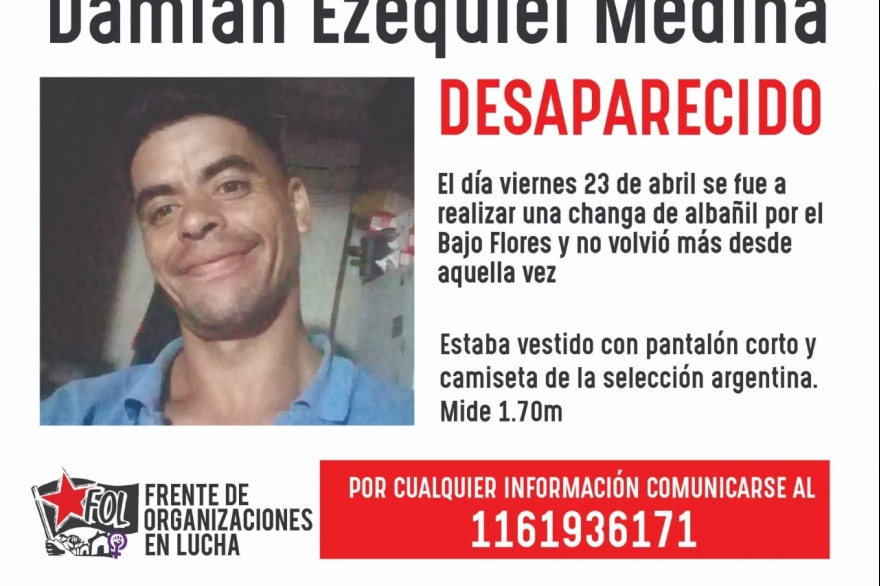 Damián estaba vestido con pantalón corto y camiseta de la selección argentina, la última vez que lo vieron. Es un trabajador del Frente de Organizaciones en Lucha (FOL) que desde hace tres semanas está desaparecido.