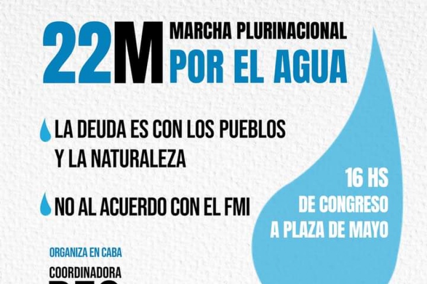 En Ciudad de Buenos Aires, se realizará una marcha desde el Congreso hasta Plaza de Mayo, a partir de las 17, convocada por la Coordinadora Basta de Falsas Soluciones en la Red de Organización de la Marcha Plurinacional por el Agua para los Pueblos. En otras ciudades como Córdoba, Mar del Plata, Esquel en Chubut, Mendoza, la convocatoria incluirá el Festival por el Agua para la Vida y abrazos a arroyos.